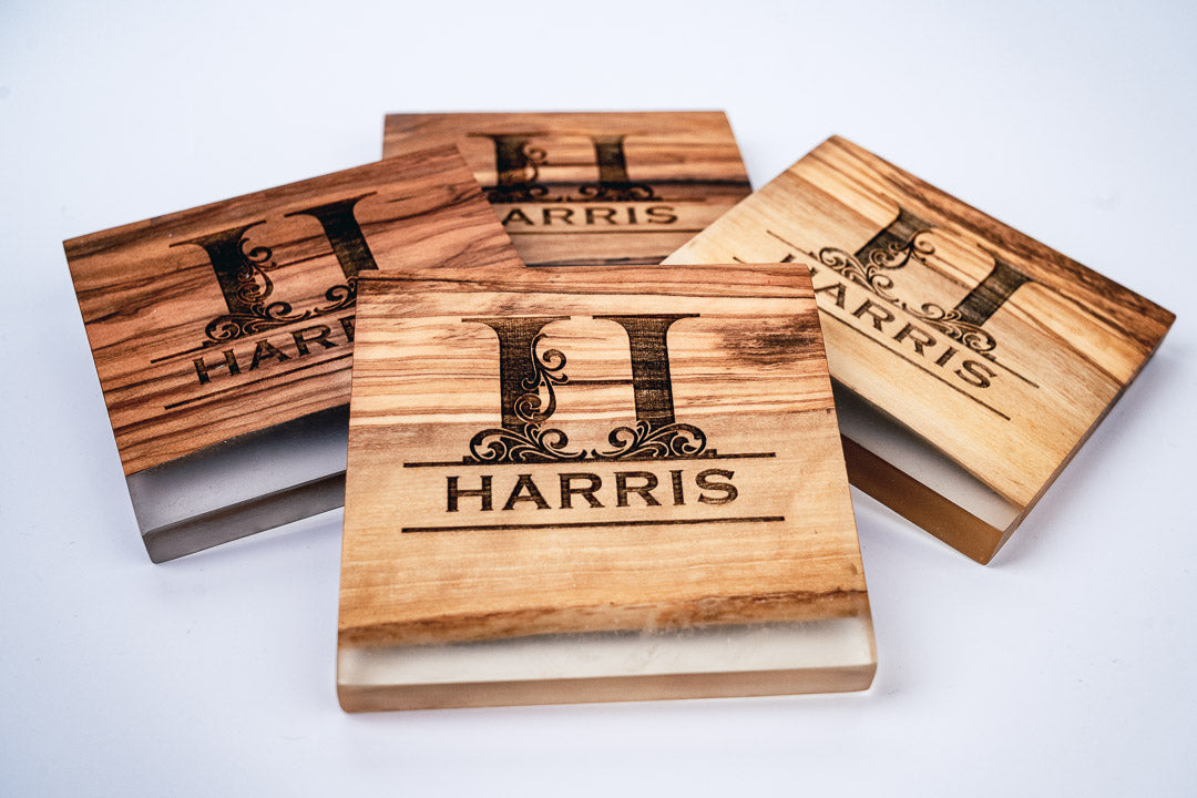 Add a personalized touch to any living space with this set of four custom wood and resin coasters. With their engraved designs, these coasters make a perfect gift for weddings, new homes, or entertaining in style.