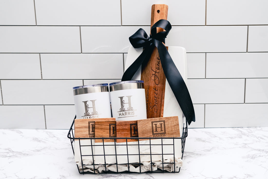 Give the gift of luxury and personalization with our Acacia + Marble Custom Gift Set. This sophisticated bundle includes an engraved board, matching coasters, and insulated tumblers—all personalized to create a cohesive, memorable gift. Ideal for weddings, housewarmings, or VIP client thank-yous.